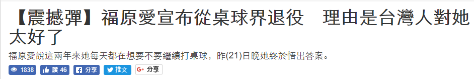 消息公布后,日本NHK电视台也介绍了海峡两岸民众对福原爱退役的不舍。虽然福原爱在台湾地区远不及在大陆受欢迎,网友和媒体还是送上了祝福,甚至有台媒往自己脸上贴金:“退役是因为台湾人对自己太好”。