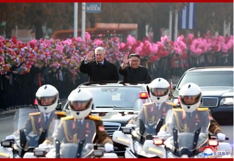 随后,金正恩同迪亚斯 - 卡内尔一起检阅朝鲜人民军仪仗队,并向热烈欢迎的朝鲜群众挥手答礼。