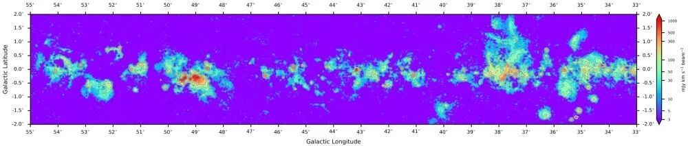 ▲FAST揭示的银河星际氢原子气体分布图(速度区间-150 km/s到+150 km/s的累积)。