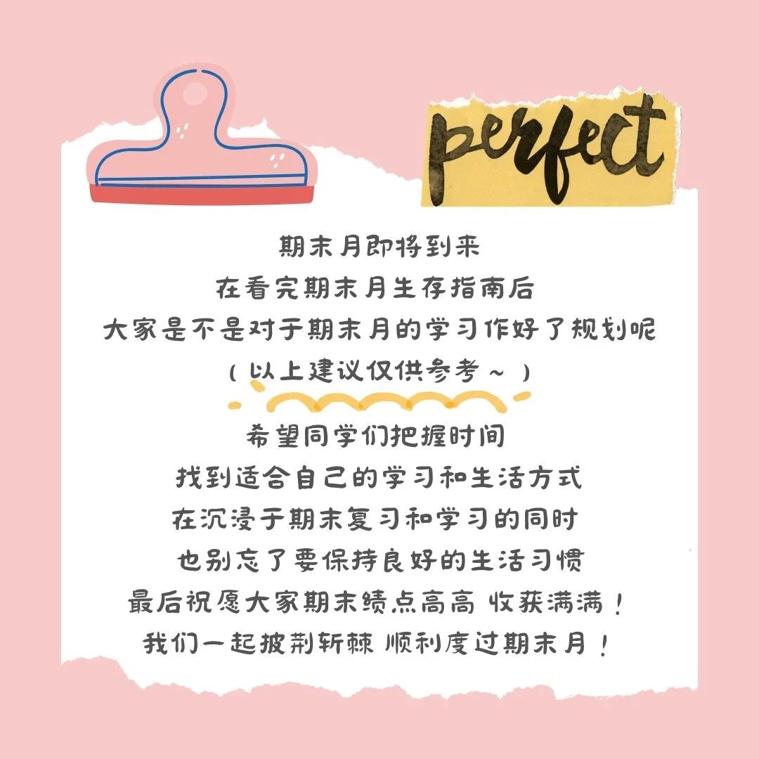 看完这个期末月生存指南,相信你一定了解了在为期末月做准备时,明确学习目标、制定计划和进行知识总结,在生活中规律作息和饮食、保持运动和及时减压这几点的重要性。