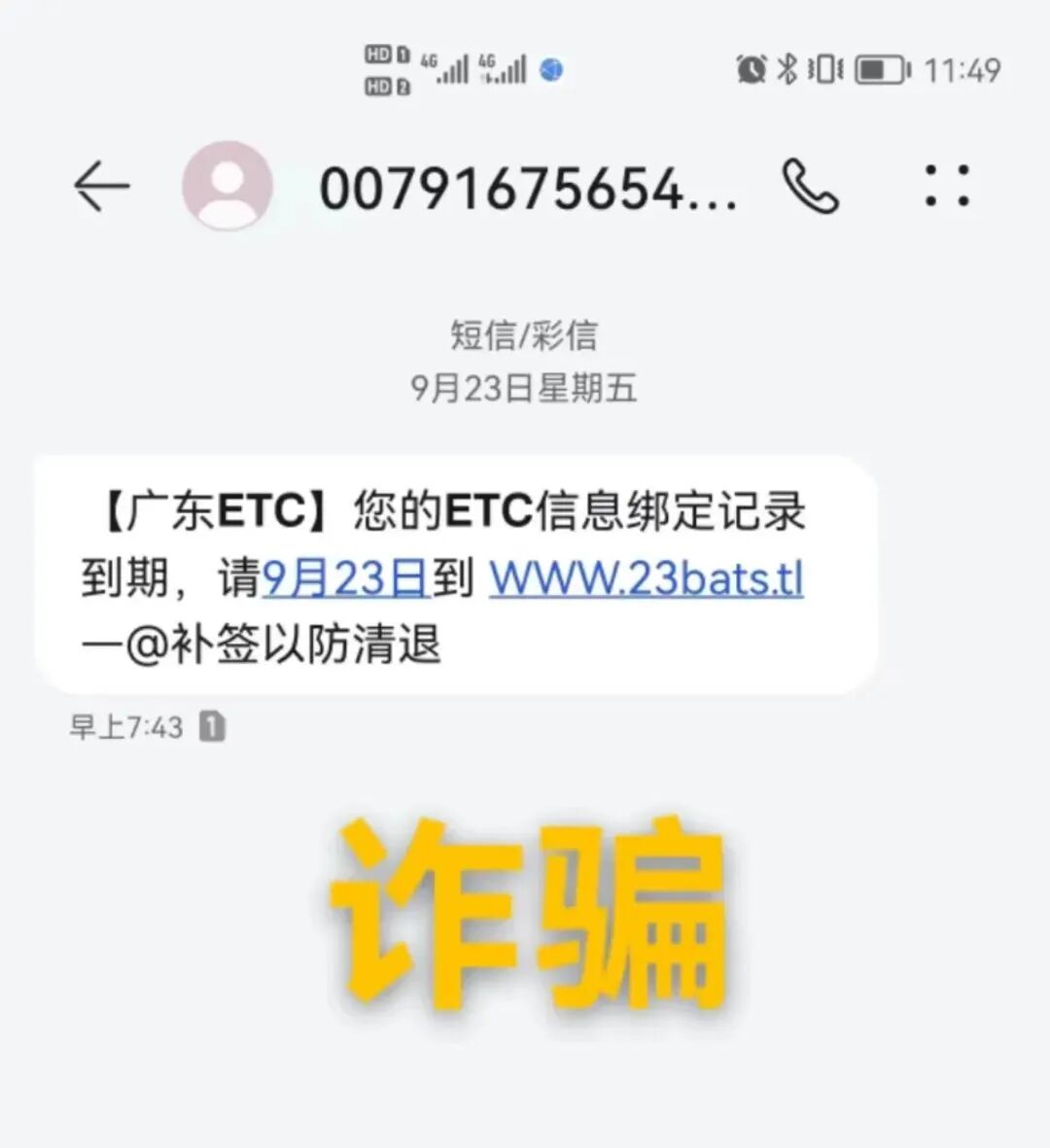 9月24日,黄女士急匆匆来到派出所求助……原来,在9月23日,黄女士收到了一条标有“广东ETC”字样的短信,短信上称黄女士的ETC信息绑定到期,要在9月23日前补签以防清退。