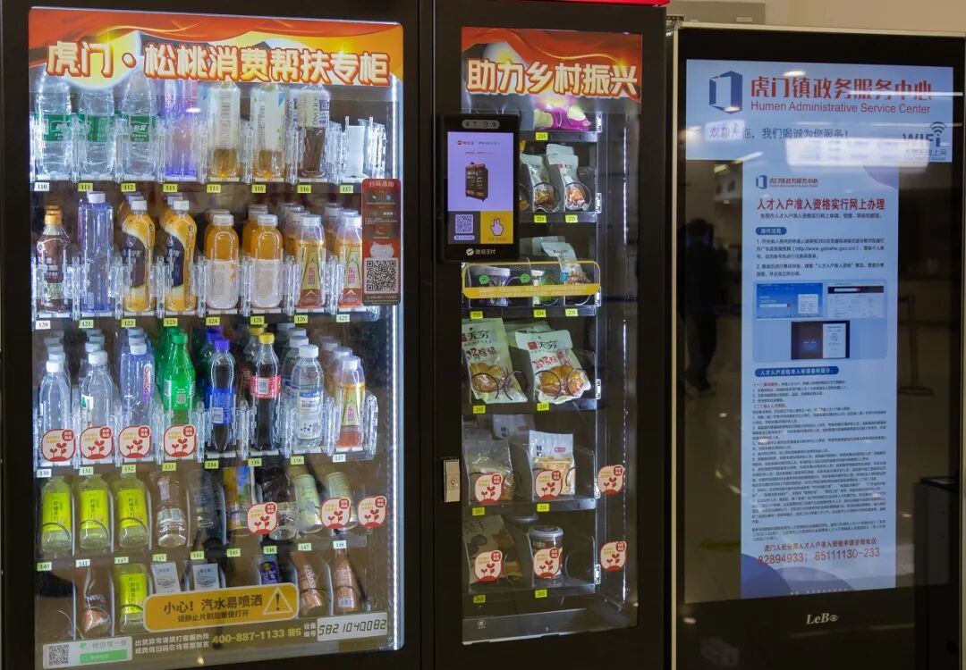此外,虎门镇还计划分三年(2021年-2023年)在全镇范围内投放510台消费帮扶专柜。其中,第一年完成投放专柜160台,第二年完成投放专柜160台,第三年完成投放专柜190台。2021年,首台虎门·松桃消费帮扶专柜在虎门镇政务服务中心办事大厅正式运营,市民只需在智能显示屏上选择商品图案或输入商品货道号,用手机微信、支付宝扫描完成支付,即可买到心仪的饮料、零食等商品。