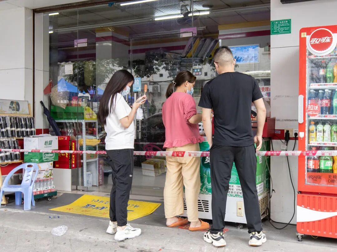 据了解,除了便民采购点外,临时管控区的小超市、便利店内生活物资供应充足,通过无接触式销售的方式,市民群众可在店铺入口完成商品挑选、称重、结账等环节。