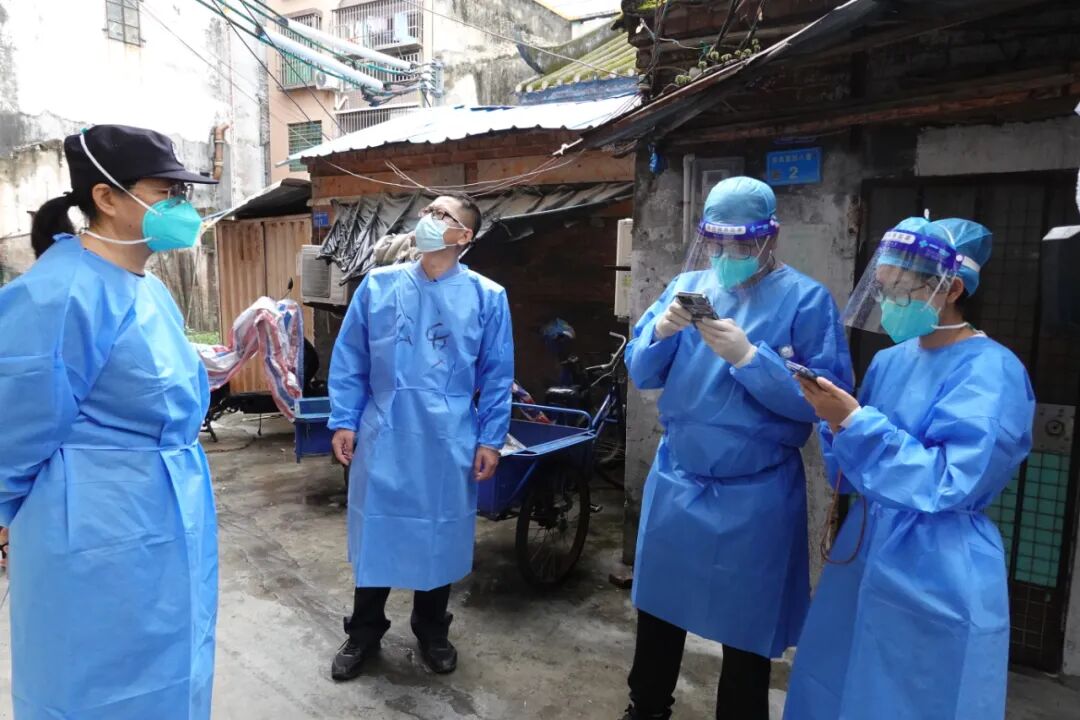 在赤岗中心广场,核酸检测机动组的工作人员和医护人员穿戴好防护装备,对照上门服务台账进行分工后,便分头行动,上门为高龄老人以及行动不便的特殊群体进行核酸采样。