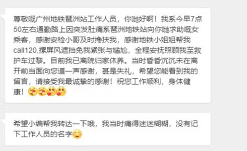 ○ 一名女乘客留言感谢琶洲站,是什么原因呢?