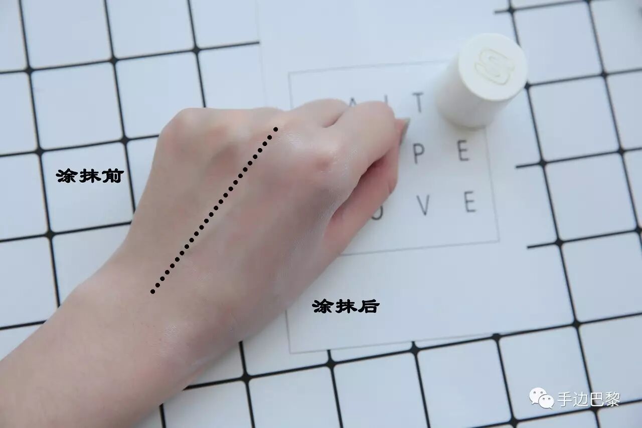白色乳液轻拍即刻涂抹开来,完全吸收后是透明状的,
