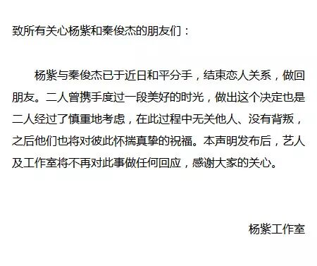 井柏然倪妮分手时,井柏然工作室发声明;马思纯欧豪分手时,双方工作室发声明,到了杨紫秦俊杰分手时,双方工作室又双双发出声明。