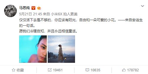 同日,马思纯在微博中分享了一句安徒生的话,“仅仅活下去是不够的,你应该有阳光,自由和一朵可爱的小花,愿我们冷暖自知,并且永远相信童话。