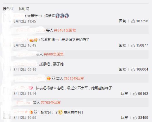 所以杨紫一宣布分手,站张一山杨紫这对CP的网友彻底坐不住了。通通跑去张一山微博底下喊话,要求张一山赶紧娶了杨紫。