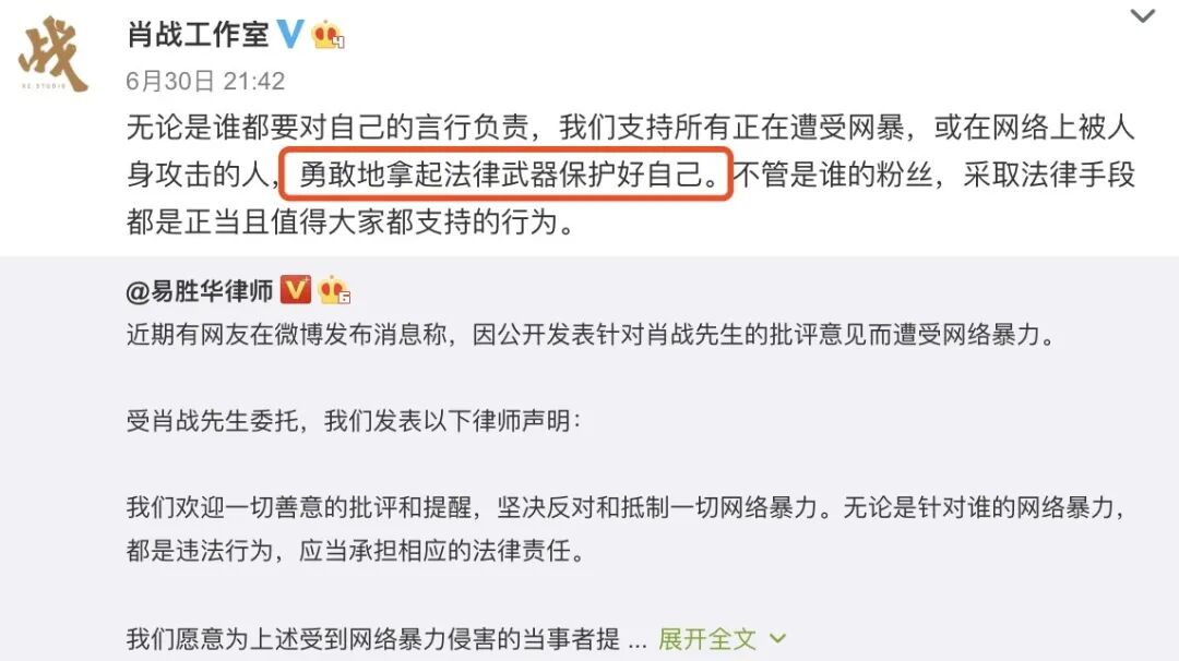 很明显肖战的态度是和博主统一战线,抵制网络暴力,支持拿起法律武器保护自己,这也是肖战工作室转发文案所想引导的方向;而另外一波人则认为肖战是和粉丝统一战线,打着替博主维权的幌子实则变相要网暴证据,不排除有威胁的嫌疑。