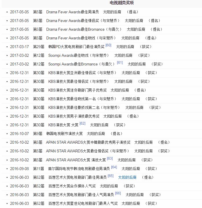 而且,《太阳的后裔》收视率高得离谱,而且一部戏就让宋仲基拿了不少奖,虽然都不是什么大奖吧。