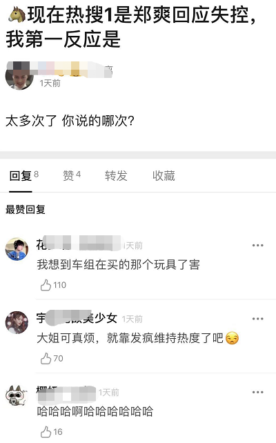 但她红也是真的,虽然我不知道喜欢郑爽都是什么年龄层的粉丝,但她就算再作就算再任性就算再发疯,也还是有人为她默默善后,那些前排控评的粉丝真的很真情实感。