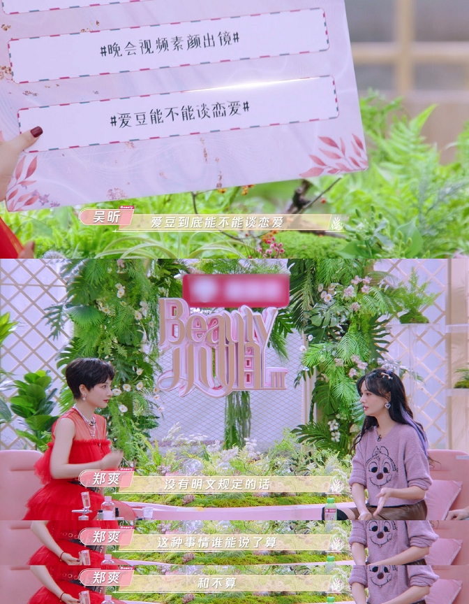 所以这次郑爽没提胡彦斌了,把目标对准了另外一个前男友:张翰。能看出节目组也是想结合最近爱豆塌房的热点话题,吴昕问郑爽#爱豆能不能谈恋爱#,于是郑爽开始疯狂输出自己的观点。
