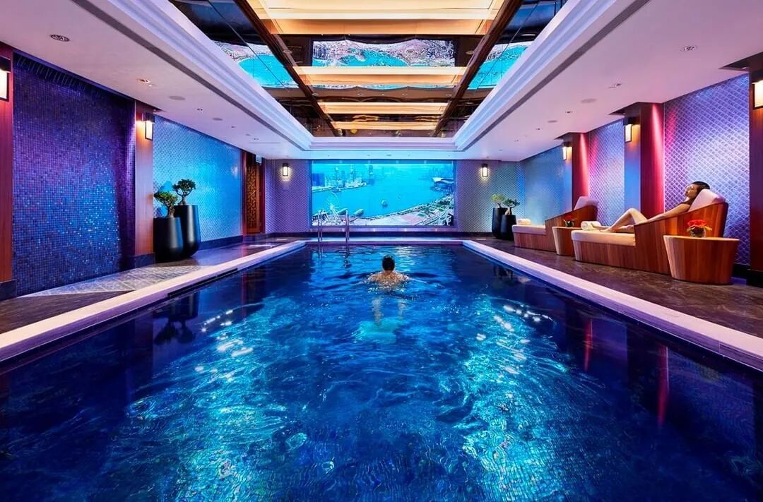 两度改造的酒店泳池里也是先锋地设计了一块大屏直播维港,用以弥补泳池没有景观的缺憾。