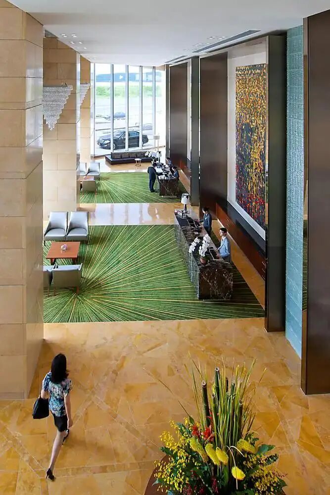 公共区域内照例有着大量的精美艺术品进行装点,出自美国建筑大师 Frank Gehy的三条锦鲤、大堂左侧则挂着北京王府井分号的“镇店之扇”都是酒店标志性的艺术品。