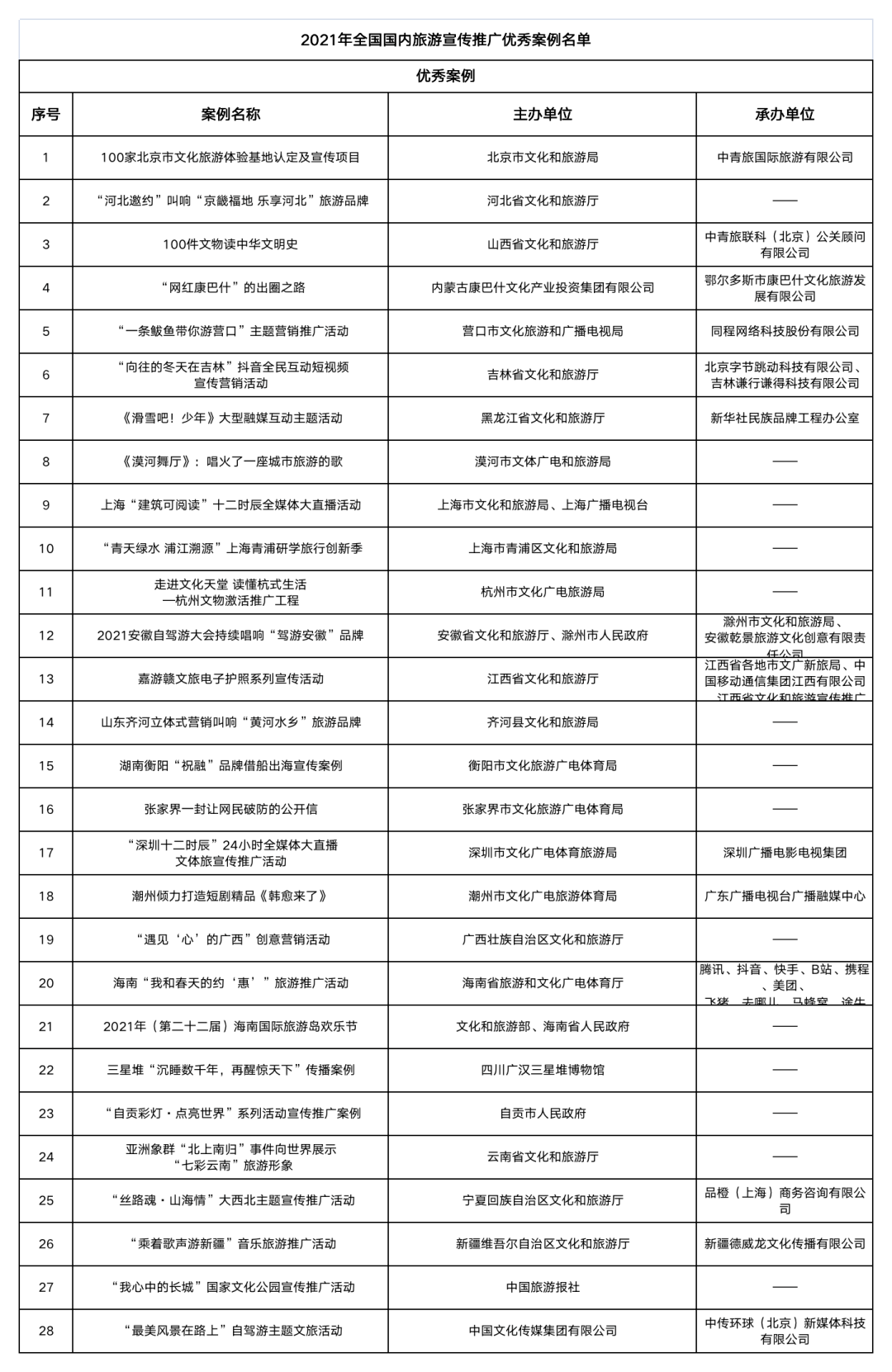 近日,文化和旅游部发布《文化和旅游部资源开发司关于发布2021年国内旅游宣传推广优秀案例名单的通知》,通知要求,经有关省级文化和旅游行政部门、文化和旅游部有关直属单位推荐,本着树标杆、立典范、强引领原则,经专家组评选,确定28个案例为2021年国内旅游宣传推广优秀案例。