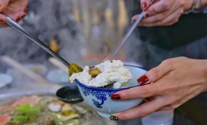 冰粉简直就是解辣神器,淋上红糖,再撒上葡萄干、花生碎、山楂片、红豆碎等各种配料,搅拌在一起吃。很多外地的火锅店也在卖了,但大多数是用冰粉粉兑出来的,到了成都一定要吃一碗正宗的糍粑手搓冰粉。