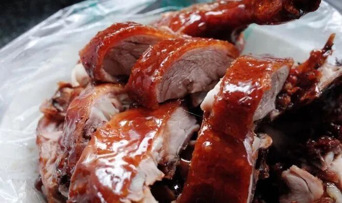 甜皮鸭是鸭子用卤水和糖腌渍好后,再用滚油一勺一勺淋熟的。所以外皮吃起来是又干又脆的,鸭肉则不柴不老,没有一点鸭臊味,甜度也刚刚好,不腻人。