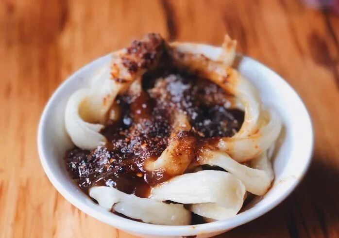 甜水面的面条有筷子头那么粗,有韧性且口感劲道。调料里用了复合酱油,所以是甜口的,还有很多花生碎和少许的花椒提香。