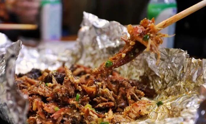 跷脚牛肉的来源相传是因为生意太火爆,没有座位,有些食客就直接坐在门口的台阶上跷着二郎腿端碗即食,于是就形成了跷脚牛肉这么一个叫法。跷脚牛肉是把牛身上的各式各样的部位混合在一起,加入香料制成的。