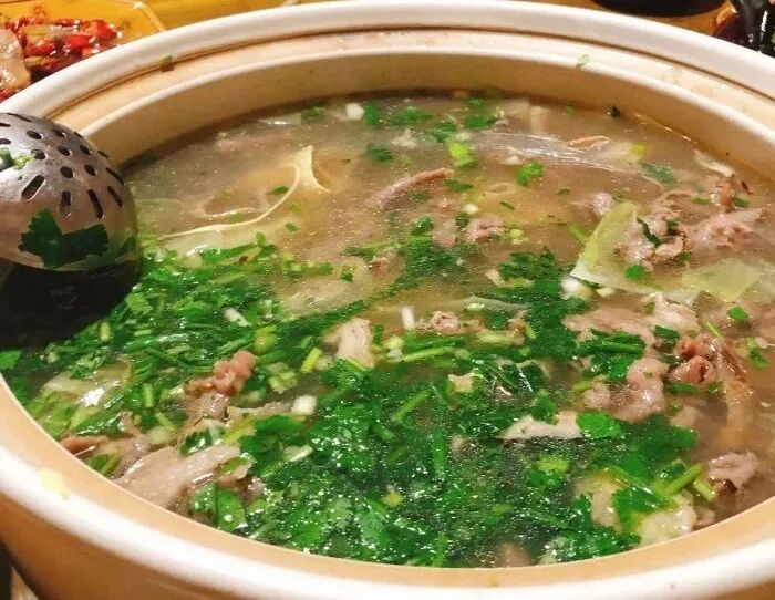 成都人每逢冬至都要吃羊肉汤,而成都公认最好吃的羊肉汤是简阳的。汤炖成乳白色,先喝一碗羊肉汤,超鲜!再捞出来切的薄薄的羊肉和羊杂,就着蘸水吃。