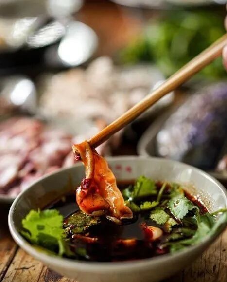 还形成吃素菜用荤蘸水,吃荤菜用素蘸水的各种讲究,可谓一蘸一味,百蘸百味。有些蘸水店的蘸水甚至可以单独打包出售。