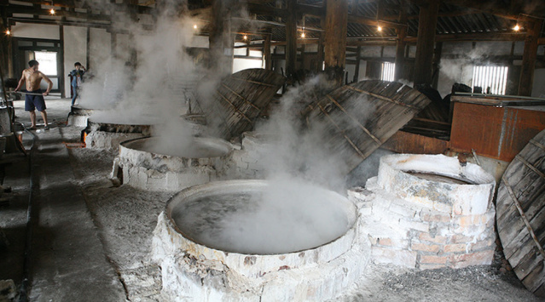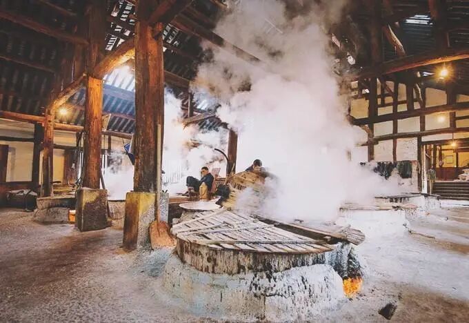 盐工们从盐井中汲取原卤,再加热卤水提清化净打捞出杂质,随着水汽的蒸发,看到卤水逐渐浓稠结晶,最后完全变成晶体。再由盐工们铲下来,重新淋盐沥水、炕盐,最后得到干净的食盐包装成袋。整个过程穿越时空重现在眼前,不得不再次感叹先人的智慧。