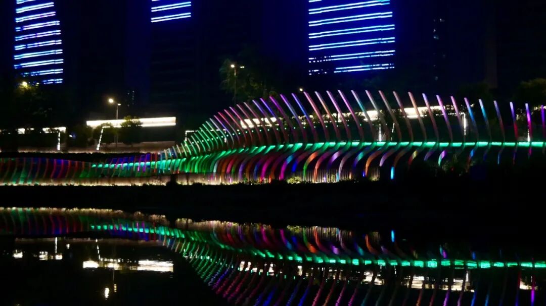 绚丽的彩灯和远处的高楼大厦交映在水面上,游船慢慢的前行,滑出一道道波纹,让人感到安心和祥和,也让人感受到了这座城市的生机与活力。