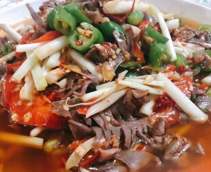 这家桥头三嫩,是很多自贡人每周都要驱车二十多公里来吃的。桥头是指餐馆所处的桥头镇,三嫩是火爆猪肝、火爆肚头和火爆腰花。这三种食材都非常考验厨师对火候的掌握,前前后后十几秒起锅装盘,腰花大片,肝片极嫩,猪肚脆嫩弹牙,鲜香可口。