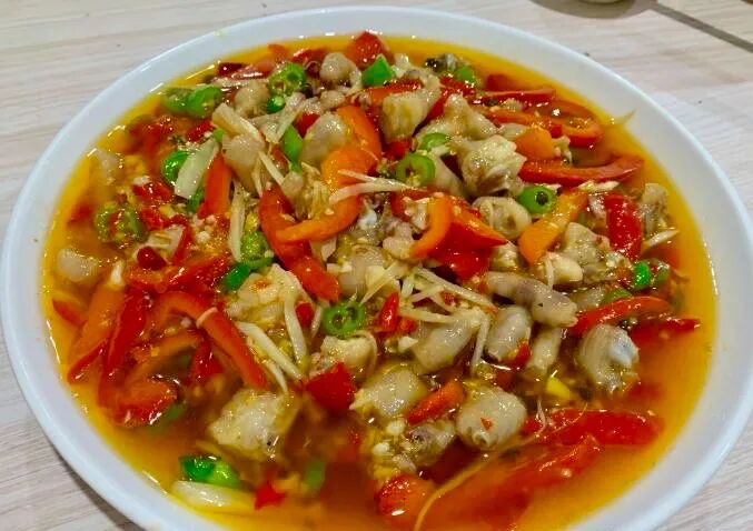 自贡的厨师一改川菜中仅使用泡椒、干辣椒、老姜做菜的传统,将鲜辣椒、仔姜直接用在菜中,保持了辣椒、仔姜的鲜味,将辣椒的辣与姜辣融合,使菜辣得更刺激、辣得更清爽,鲜味十足。