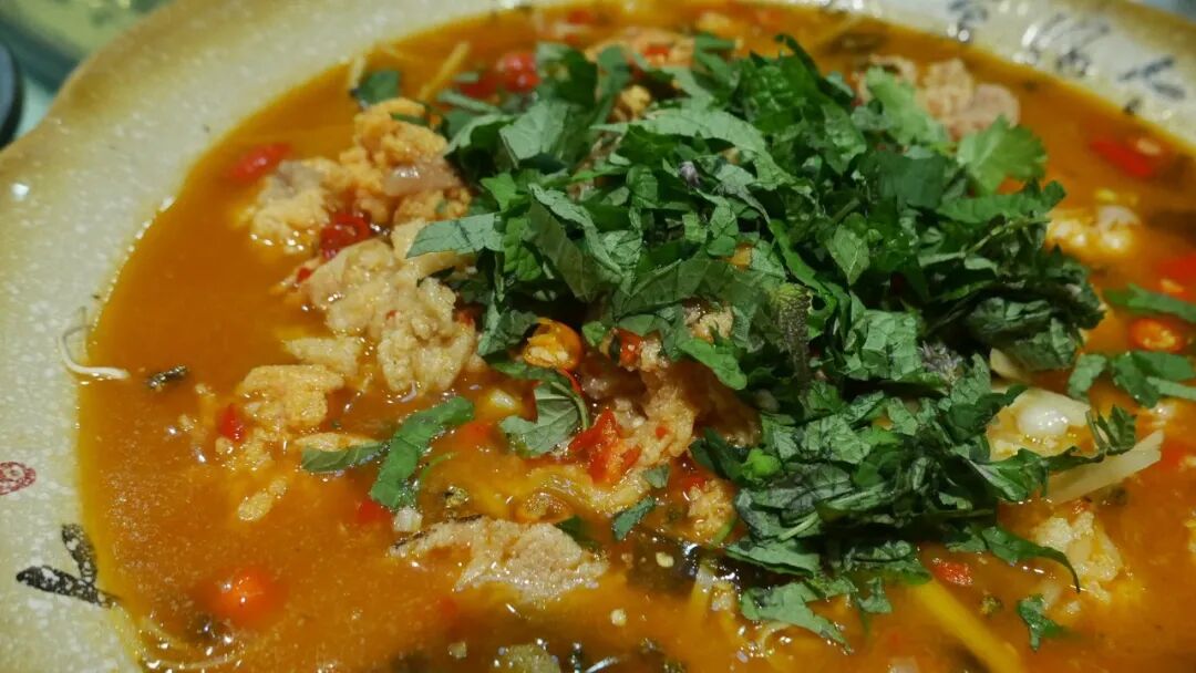到自贡吃鱼一定要说这家,鲫鱼上面全部铺满了葱葱,然后给每人发一个盘子,把香浓的热油淋到每个盘子里,香气一下子就弥漫开来!想着这个画面都想吃。