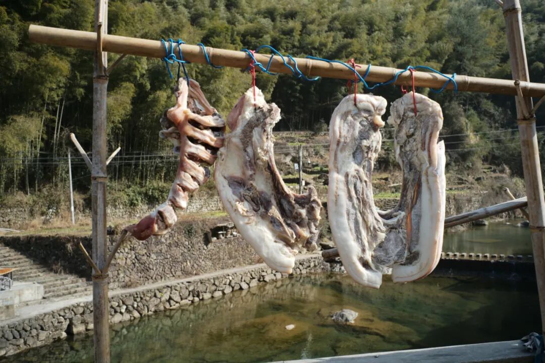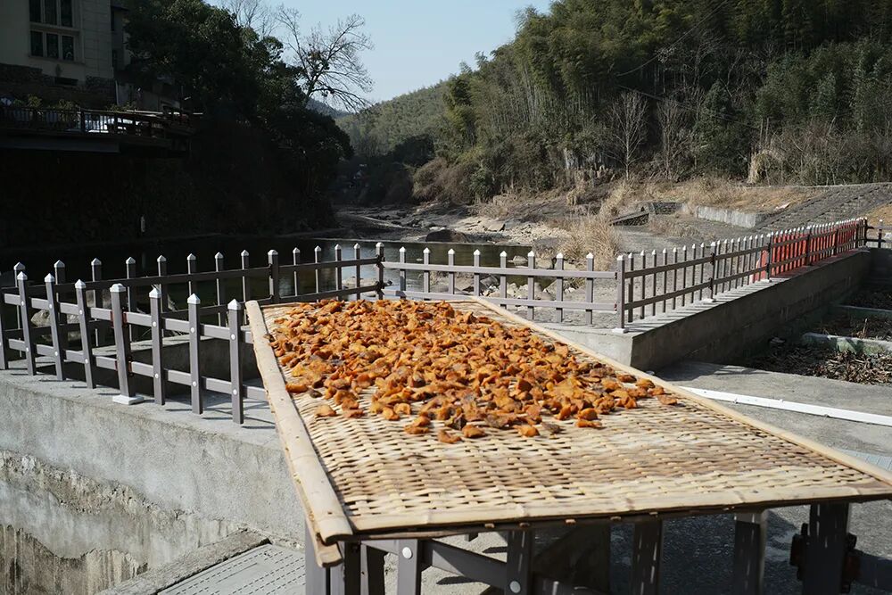 沿溪的两边,因为阳光好,村民们都在晾晒番薯干、鱼干。