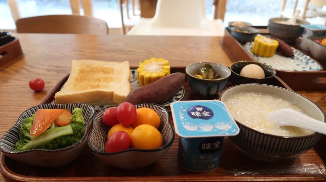 早餐一人一份,基本就是粥+粗粮+水果+谷物的搭配,看起来挺健康的。