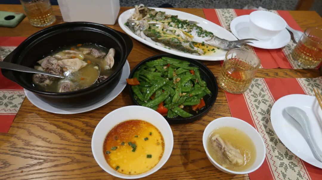 管家安排的晚餐是:一锅土鸡汤、一条鲈鱼、一份炒荷兰豆、一份蒸蛋。