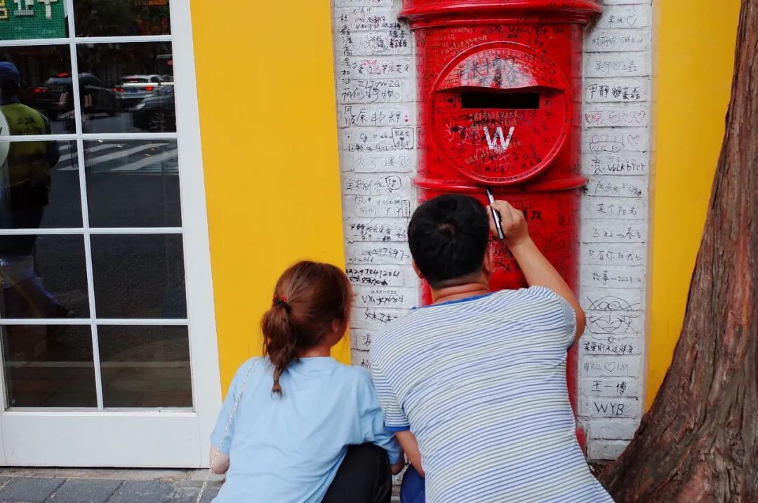 认真地在邮筒上留名的情侣