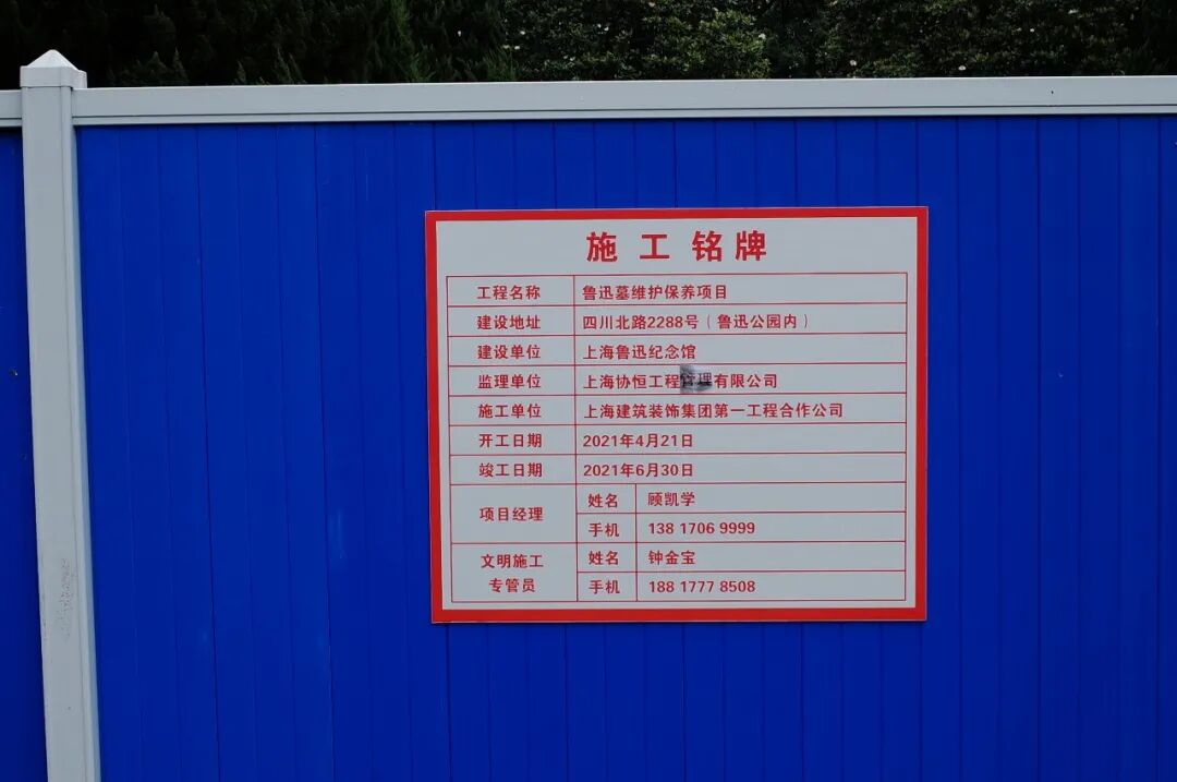 从鲁迅纪念馆走出,鲁迅墓在公园更往北些的地方。第一天去时,我并没找到。第二天询问工作人员后才知道现在墓正在维修,只能远远地站在蓝色围栏外看一眼先生的铜像。![]()