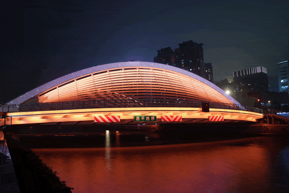 上面这些桥都比较有年代感,新造的昌平路桥就完全换了个风格。据说它是以“苏州河之眼”为灵感设计的,晚上亮起灯后比较有看头。