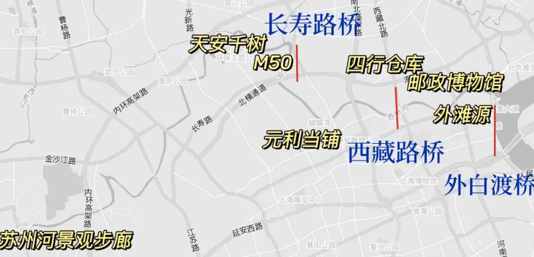 细心的你可能也发现了,河上的大多数桥都是用附近的路名来命名的。50公里的河配30余座桥,也就是说每隔2公里不到,就有一座桥出现,所以它们是游览苏州河最好的坐标。