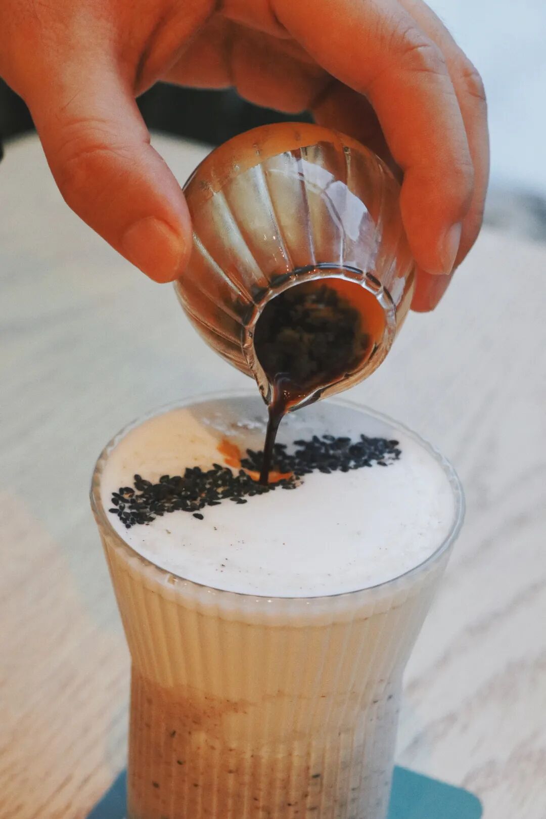 满杯沙棘、盖碗咖啡都是店内的招牌,值得一试。不过我这回另辟蹊径,看着菜单放光,点了一杯养生黑芝麻拿铁,这个名字听上去就很健康。