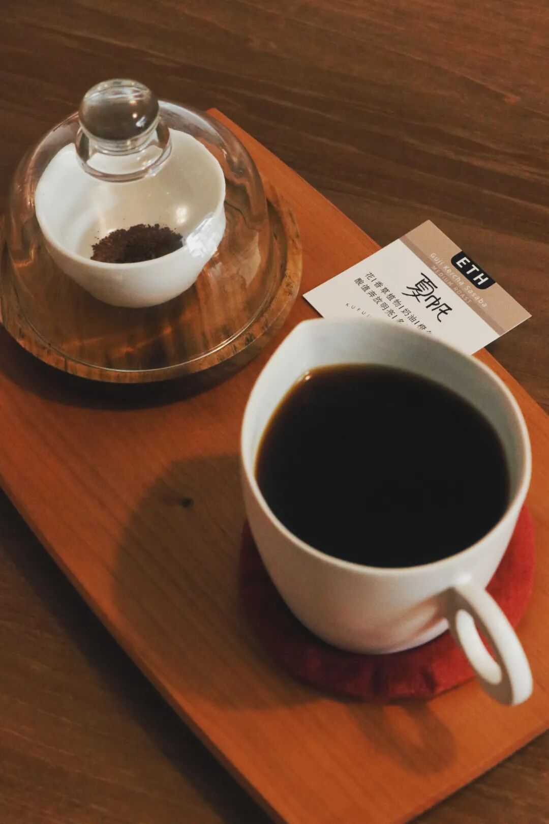除了咖啡之外,新鲜磨好的咖啡豆粉末也会一同在杯子旁,还会附赠咖啡豆小卡片,上面有咖啡豆的产地、风味以及烘焙时间,真的相当贴心。