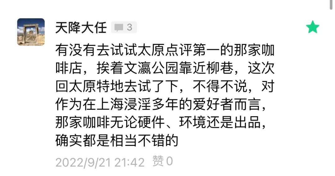 文章留言中有不少老乡,着实亲切。其中有一位粉丝留言让我记忆犹新,推荐我去喝一家太原评分不错的咖啡。巧的是,我也正准备跟大家聊聊太原的咖啡店呢。![]()