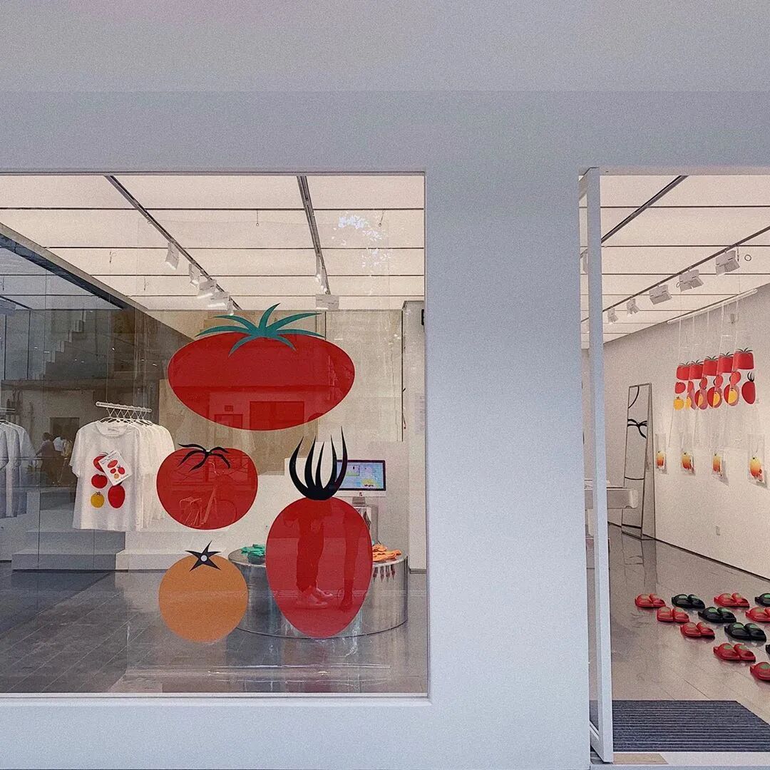 店铺把零售与展览融合在一起,打造出了一个有趣的体验空间。一楼不定期会举办一些展览,比如最近的这个以番茄为主题的展,因为强烈的视觉冲击和颜色碰撞吸引了不少小哥哥小姐姐来打卡。