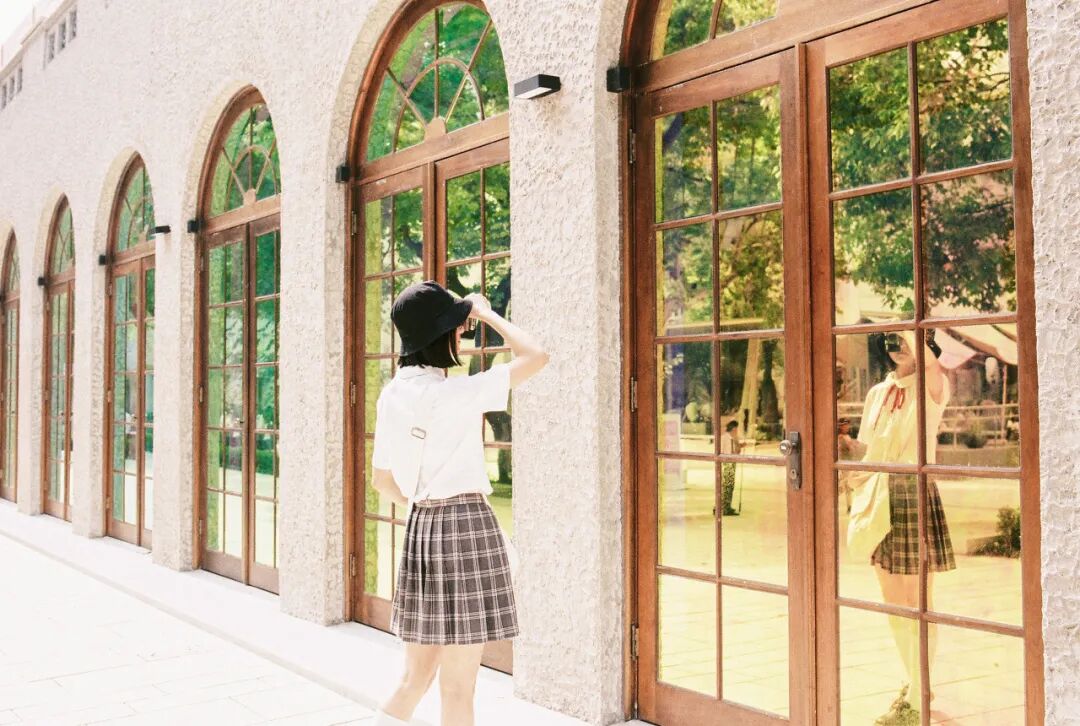 复古配色非常适合当拍照的背景,特别是这个颇具设计感的店门口。