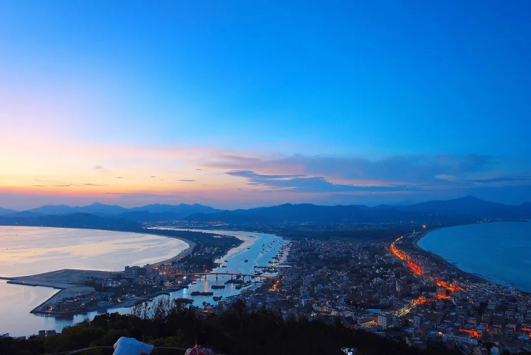 站在观景台俯瞰双月湾,白天和夜晚各有魅力。