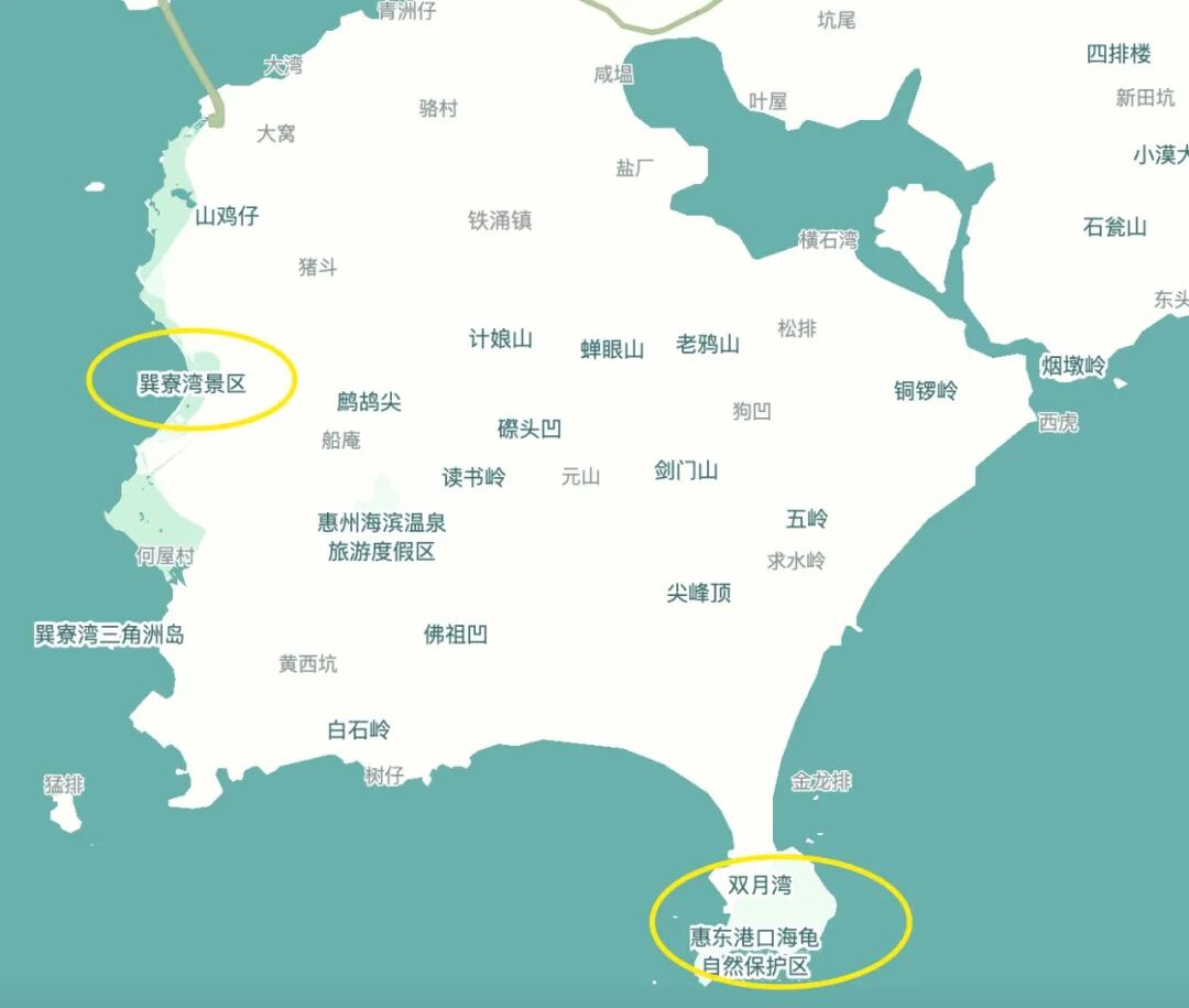 巽寮湾所在的金海湾国际滨海旅游区(图中虚线框里的)占据了很长的的海岸线,整个区有七山八湾十八景,山海之间能闻到文艺的气息,也能感受到野趣。