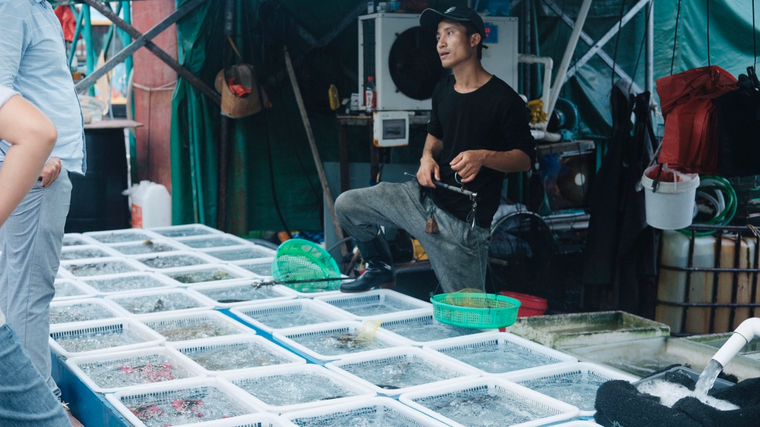 岛上吃海鲜的地方有点特别,渔村里还保留着海上鱼排。吃饭的大排档就开在竹筏上,点的鱼直接从海里的一个个网兜里捞出来。