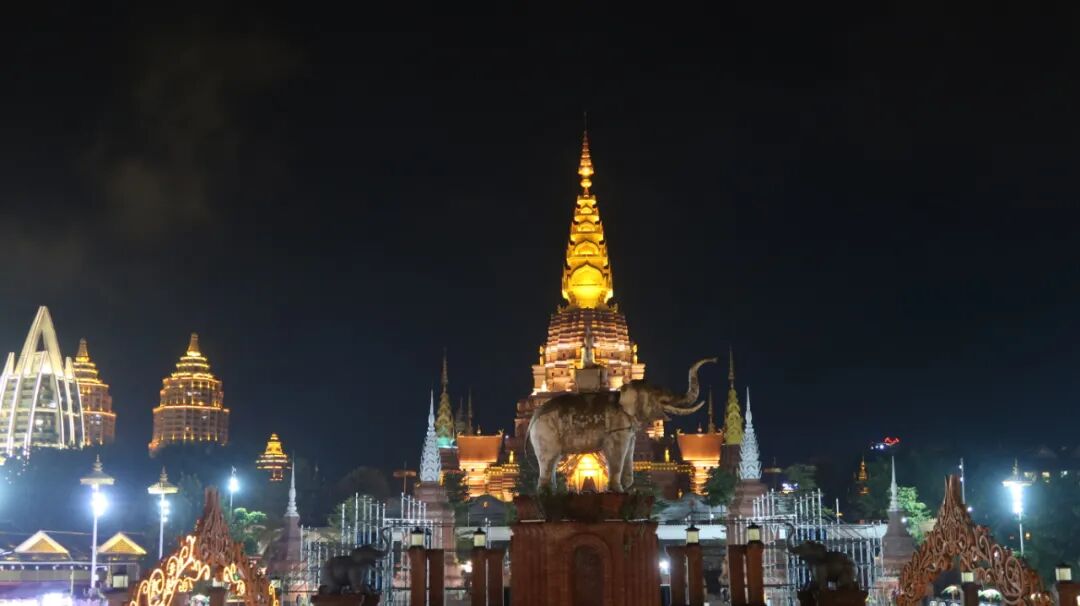 这座金塔就在星光夜市的片区,你几乎每晚逛街都会路过它。远看是很庄严的,金塔四面,都有不同的装饰。