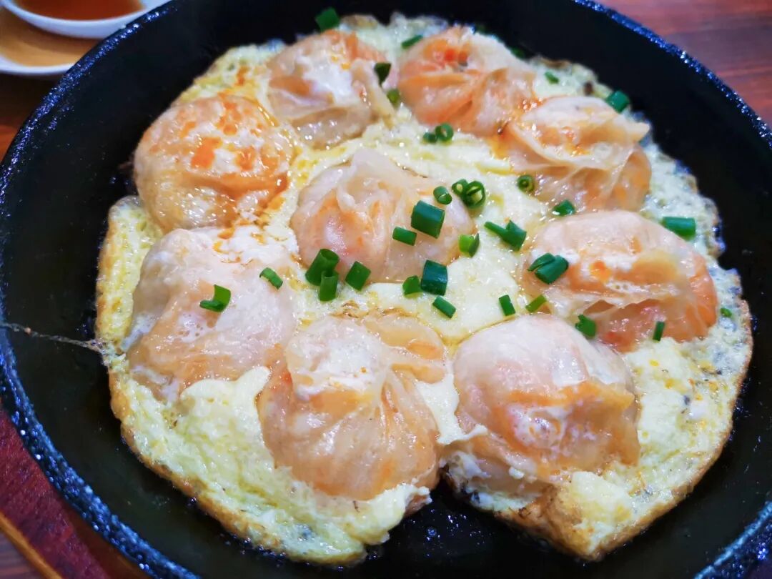 汤包做法跟煎饺挺相似的,都是大平底锅里加水加油,最后的点睛之笔是蛋液、虾皮和葱花,卖相上还是非常诱人的。
