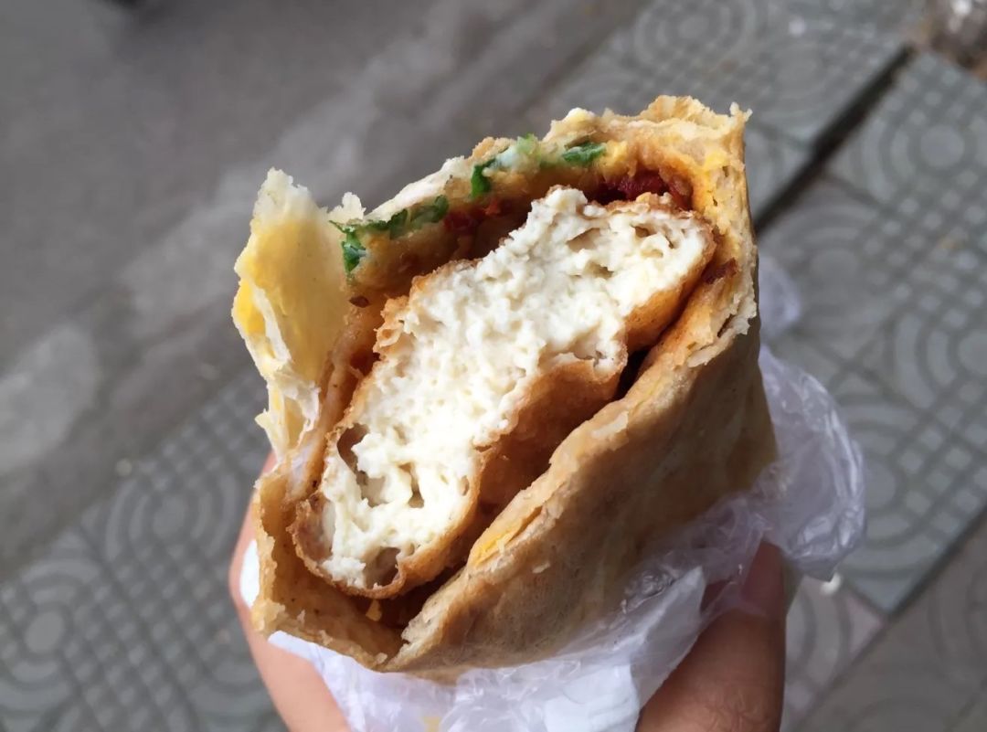 新昌春饼的皮,口感上跟煎饼果子的接近,最主要的区别在里面夹的东西上,除了鸡蛋,还有夹油饺、臭豆腐和油豆腐。