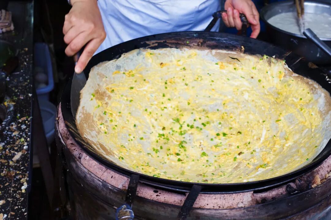 春饼皮上还敲了一个鸭蛋,好像嵊州这边吃鸭蛋的比较多。
